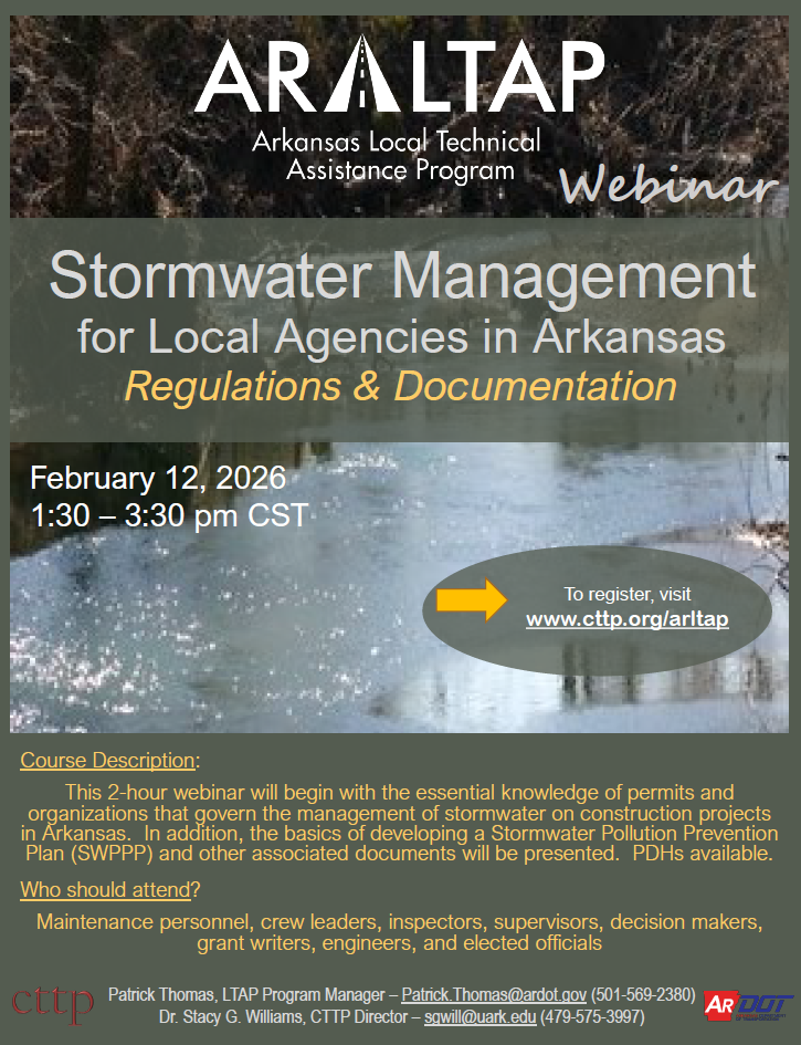 This 2-hour webinar will begin with the essential knowledge of permits and organizations that govern the management of stormwater on construction projects in Arkansas. In addition, the basics of developing a Stormwater Pollution Prevention Plan (SWPPP) and other associated documents will be presented. PDHs available.